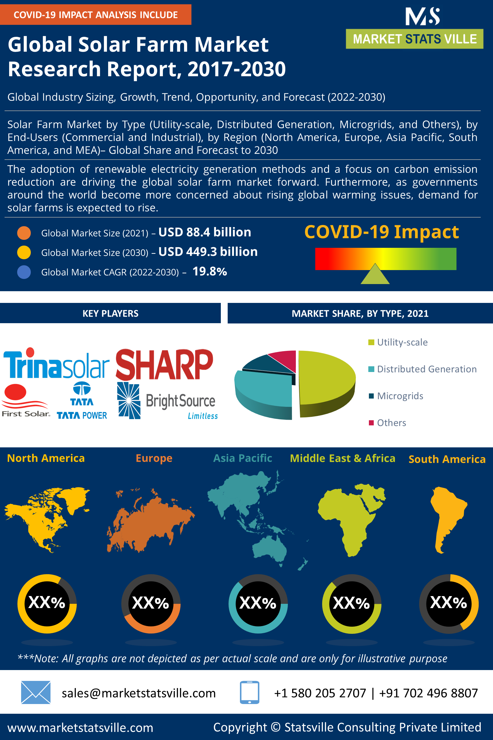 The global solar farm market size was USD 88.4 billion in 2021 and is estimated to reach USD 449.3 billion by 2030, growing at a CAGR of 19.8% during the foreca…