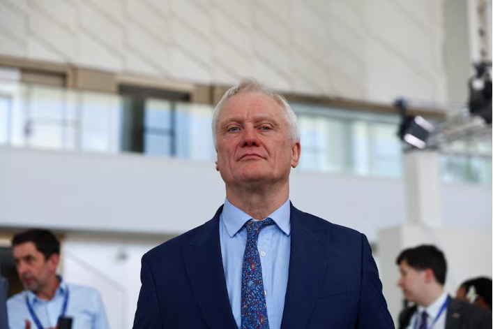 British Minister of State for Energy Security and Net Zero, Graham Stuart speaks to media after a draft of a negotiation deal was released, at the United Nation…
