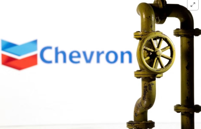 A 3D printed natural gas pipeline is placed in front of displayed Chevron logo in this illustration taken Feb. 8, 2022. REUTERS/Dado Ruvic/Illustration/File Pho…