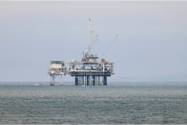 An aerial view taken from a helicopter shows the Leviathan natural gas rig off the coast of the Mediterranean coast, in northern Israel, April 26, 2023. REUTERS…