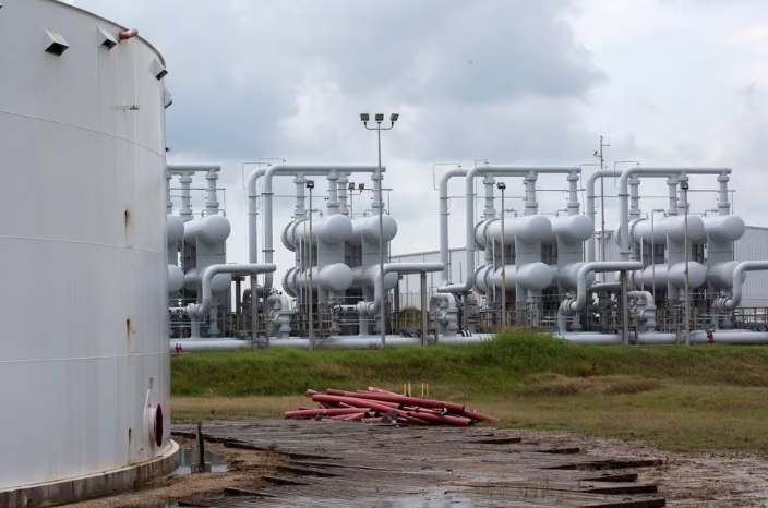 An oil storage tank and crude oil pipeline equipment is seen during a tour by the Department of Energy at the Strategic Petroleum Reserve in Freeport, Texas, U.…