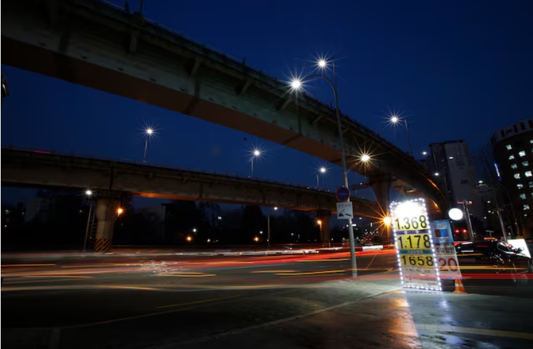 A standing signboard showing the petrol (top 1.14 USD per litre) and diesel (middle 0.98 USD per litre) prices is seen in Seoul, South Korea, February 3, 2016. …