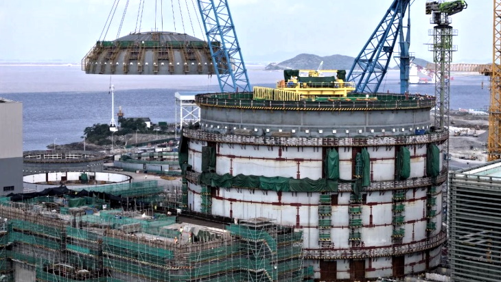 The uppermost sections of the steel containment vessels of two nuclear power reactors under construction in China - Sanmen unit 3 in Zhejiang province and Haiya…