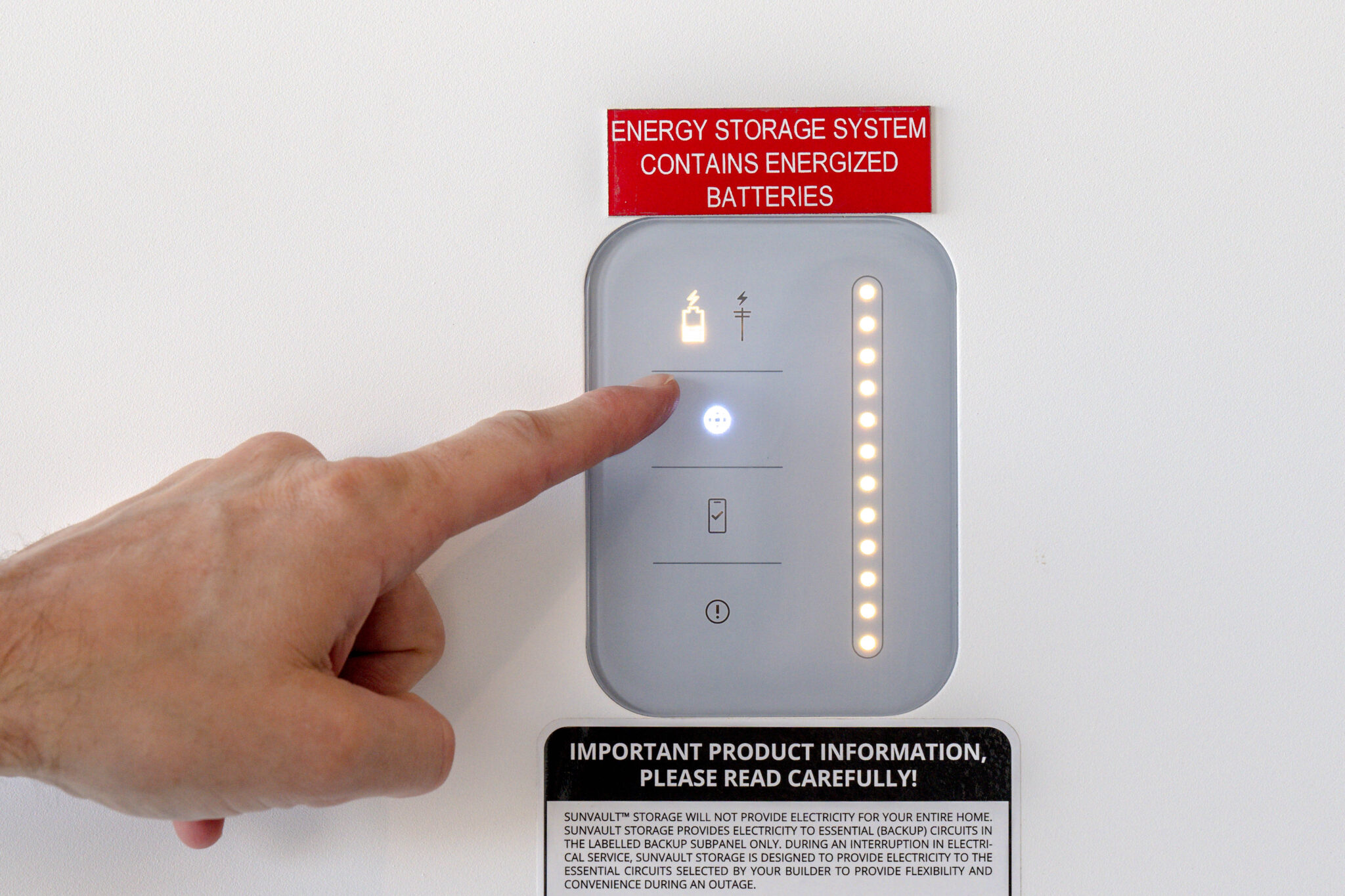 Scott Hensen, vice president of floor planning for KB Home, points to a battery display panel on a SunPower SunValut storage system inside the garage of a model…