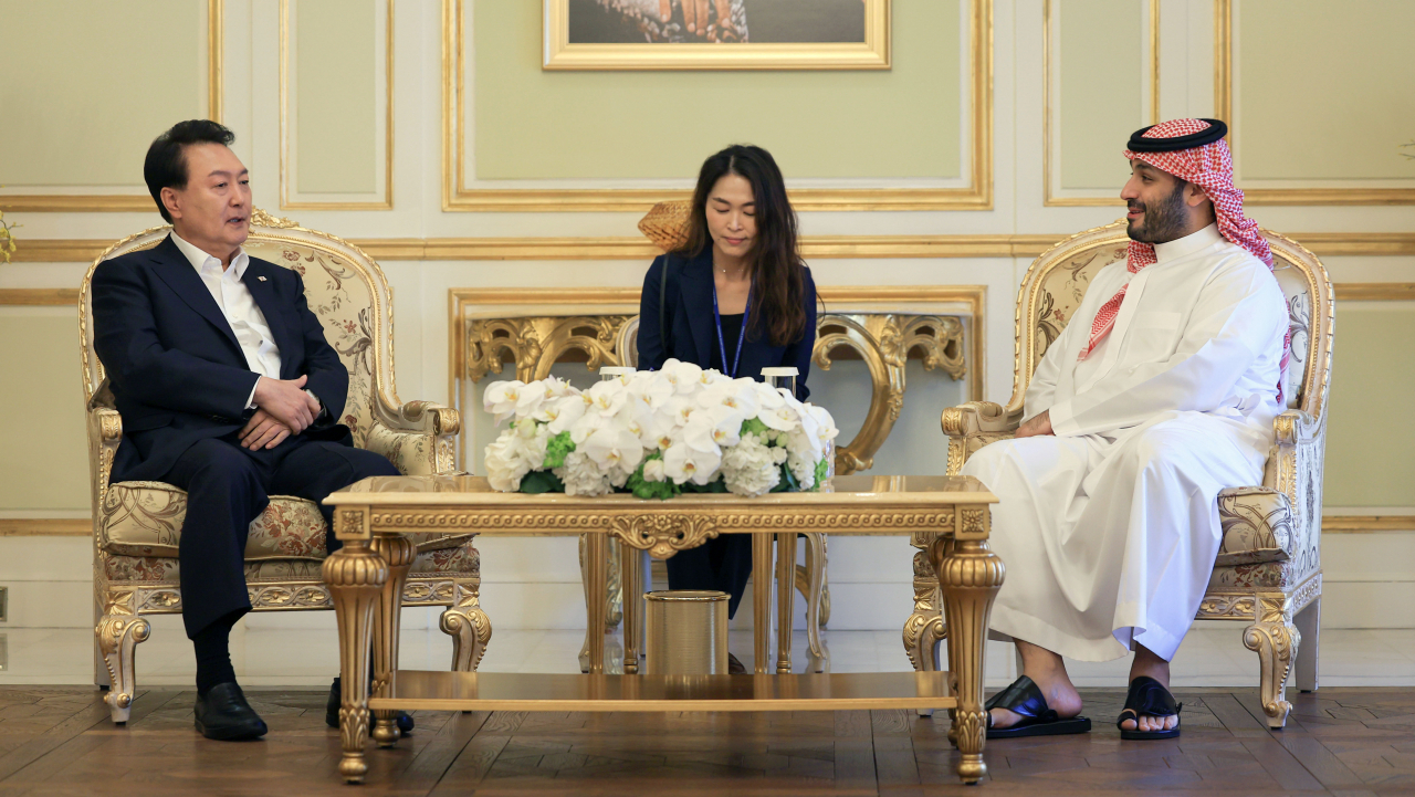 South Korean President Yoon Suk Yeol (Left) talks with Saudi Crown Prince Mohammed bin Salman (Right) at a guesthouse prior to their attendance at the annual Fu