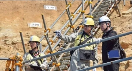 Akira Ishiwatari (right), a commissioner for the Nuclear Regulation Authority, inspects a trench at the Tsuruga nuclear power plant’s No. 2 reactor in Fuk