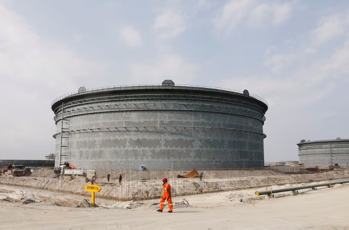 A worker walks past storage tanks at Dangote oil refinery in Ibeju Lekki district, on the outskirts of Lagos, Nigeria August 7, 2019. REUTERS/Temilade Adelaja A