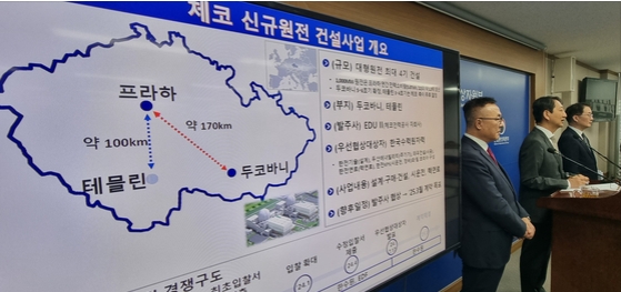 Industry Minister Ahn Duk-geun, center, and KHNP President Whang Joo-ho, far left, provide a briefing on the Czech Republic's nuclear power contract on Thur