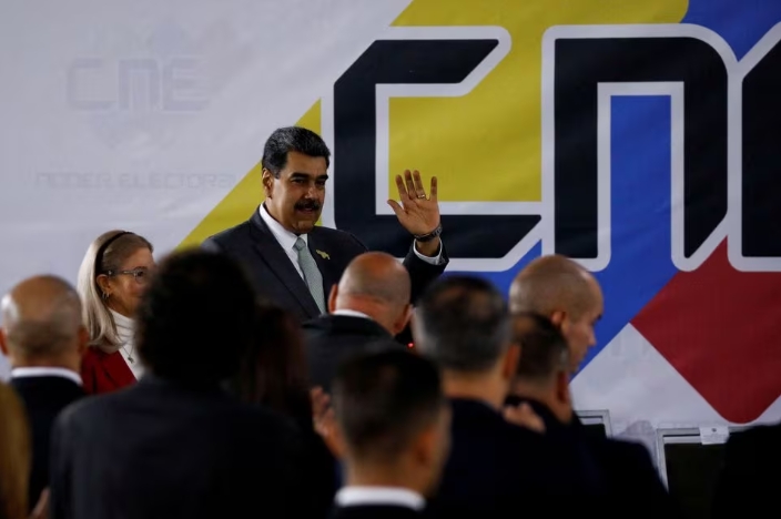 Venezuelan President Nicolas Maduro gestures as he attends an event at the National Electoral Council (CNE) after voters in a referendum rejected the Internatio