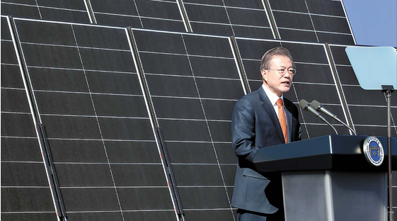 Former President Moon Jae-in speaks at a renewable energy event held in Gunsan, North Jeolla, in 2018. [YONHAP]Government funds amounting to 582.4 billion won (