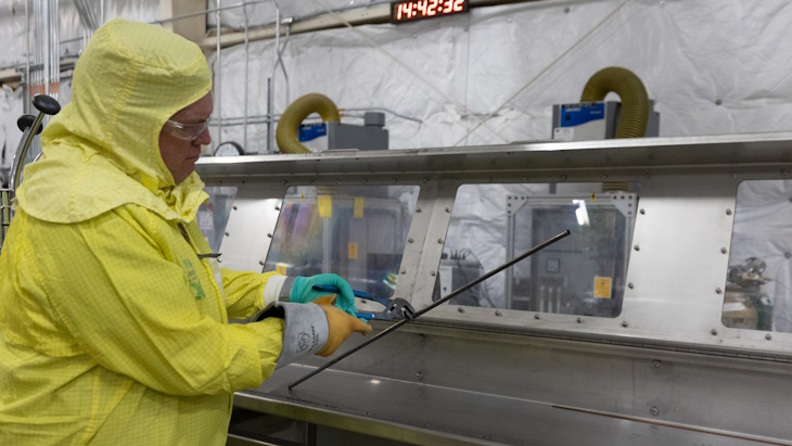 The extrusion of samples of an alloy of depleted uranium and zirconium at Idaho National Laboratory is a critical step in the process to qualify Lightbridge Cor