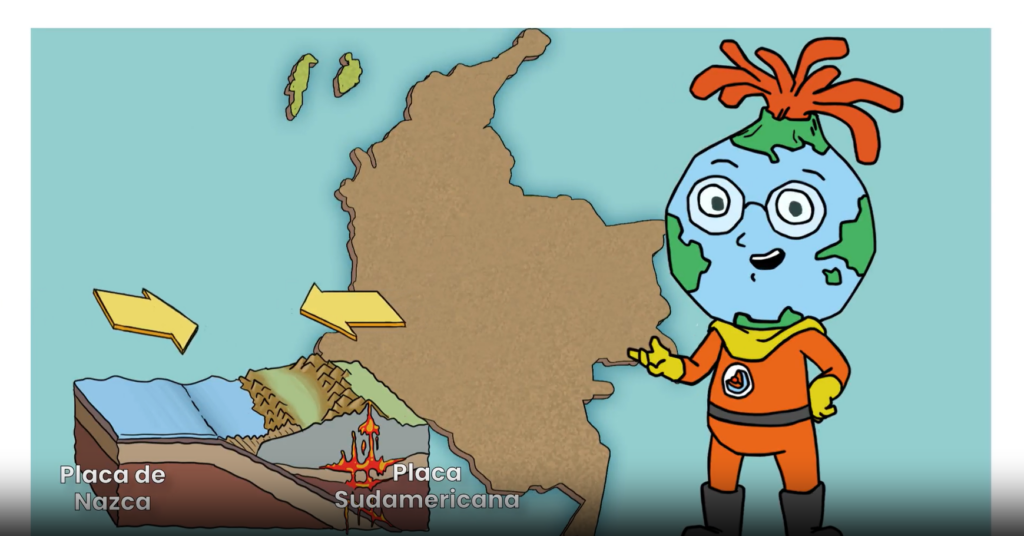 Kutani explaining the regional tectonics of Colombia (source: screenshot, "Kutani and the geothermal mission", University of Medellin)The Colombian Geothermal A